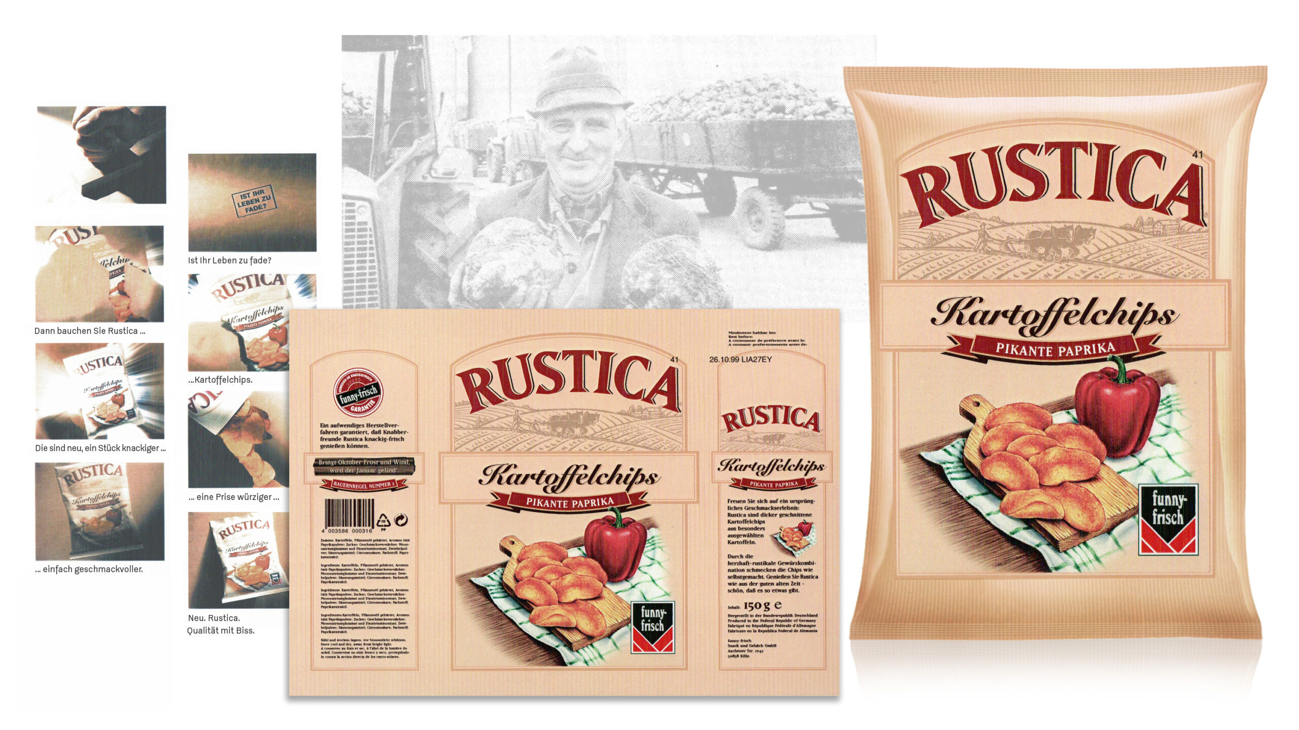 Weder Beer noch Beverage, aber häufiger Begleiter: Packungsdesign für extra dick geschnittene Kartoffelchips als Monomarke unter dem Dach von funny-frisch (mit wechselnden Bauerregeln auf der Rückseite) und dem TV-Storyboard für den Launch.